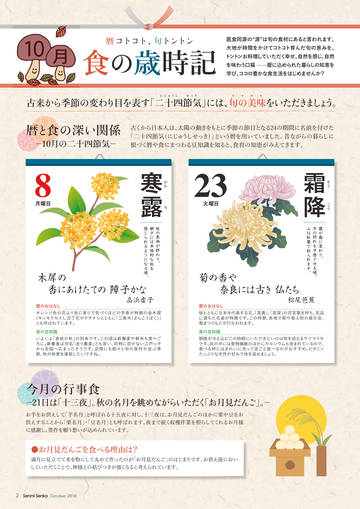 古く から日本人は、 太陽の動き をも とに季節の節目となる24の期間に名前を付けた 「二十四節気 (にじゅ う しせっき) 」 という暦を用いていま した。 昔ながらの暮らしに 根づく暦や食にまつわる豆知識を知る と、 食育の知恵がみえてきます。