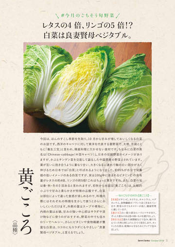 今回は、 ほんのすこし季節を先取り。 10 月から甘みが増しておいしくなる白菜 のお話です。 西洋のキャベツに対して東洋を代表する葉野菜で、 大根、 豆腐とと もに 「養生三宝」 と言われ、 精進料理に欠かせない食材です。 ちなみに白菜の英 Chinese-cabbage (中国キャベツ) 」 。 日本の伝統野菜のイメージがあり 名は 「Chinese-cabbage ますが、 かぶとチンゲン菜を交配して誕生した中国原産の野菜とされています。 葉が互いに抱き合うように重なり合い、 大きくなるに連れて軸の白い部分が太く 約 95%が水分で栄養 約95% が水分で栄養 伸びるため日本では 「白菜」 と呼ばれるようになりました。 約95%が水分で栄養 実は100g中に含まれるビタミン g中に含まれるビタミンC C の含有 価の低いイメージのある白菜ですが、 実は100g中に含まれるビタミンC 倍、 リンゴの約5倍 倍 ! これはちょ っと驚きですね。 また、 白菜の旬 量がレタスの約4倍、 初秋から出回る 「黄ごころ」 は、 比較的 は春 ・ 秋・冬の3 回あると言われますが、 柔らかさが特徴の品種です。 小ぶりで甘みと柔らかさが特徴の品種です。 白菜 は部位によって違った食感が楽しめるので、 料理の 際にはそれぞれの特徴を生かして使うとさらにお いしくいただけます。 外側の葉はスープや煮物に、 内側の葉はお鍋、 甘みの強い中心部はサラダや漬 け物などに使うのがおすすめ。 野菜の中でも低カ ロリーでヘルシー、 さらにビタミンや食物繊維が豊 富な白菜は、 ココロにもカラダにもやさしい 〝良妻 賢母ベジタブル〟 と言えるでしょ う。